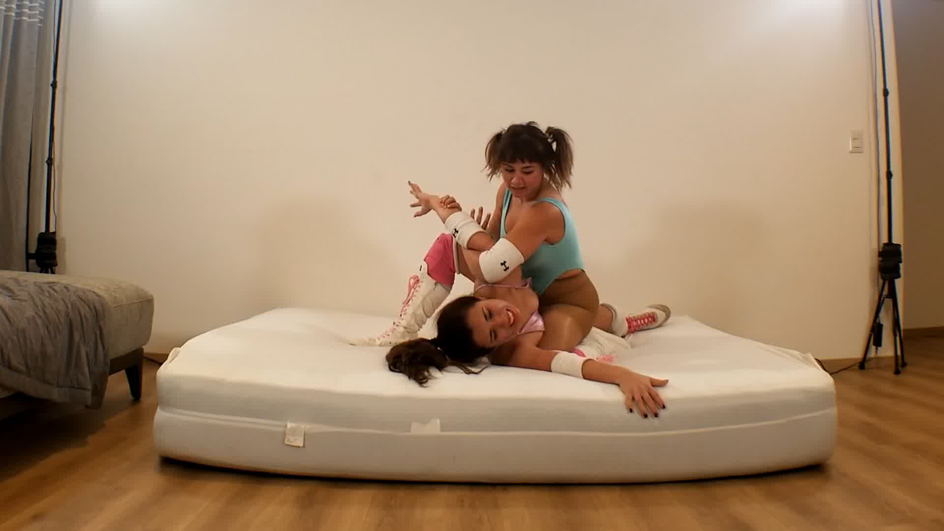 Training Series. One of our first sets before finalizing the look and set of our studio. Candy & Nina take turns performing a variety of short lucha sequences, each one ending with a 3-count pin. Moves include the bearhug, piledriver, tombstone, and over the shoulder carry. Front camera angle.